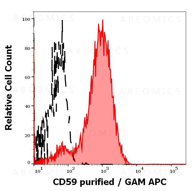 Figure 1: Separation of KG-1a cells stained using anti-human CD59 (MEM-129) purified antibody (concentration in sample 1 μg/ml, GAM APC, red-filled) from KG-1a cells stained using anti-human CD57 (TB01) purified antibody as mouse IgM isotype control (concentration in sample 1 μg/ml, same as CD59 purified concentration, GAM APC, black-dashed) in flow cytometry analysis (surface staining).