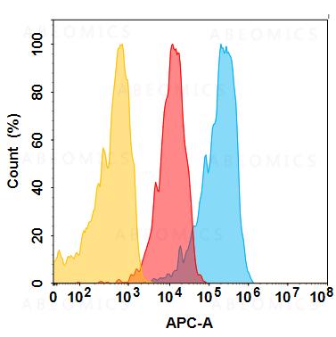 Figure 1. EPCAM protein is highly expressed on the surface of Expi293 cell membrane. Flow cytometry analysis with 1μg/mL Anti-EPCAM(oportuzumab biosimilar) mAb on Expi293 cells transfected with human EPCAM (Blue histogram) or Expi293 transfected with irrelevant protein (Red histogram),and Isotype antibody on Expi293 transfected with irrelevant protein (Orange histogram).