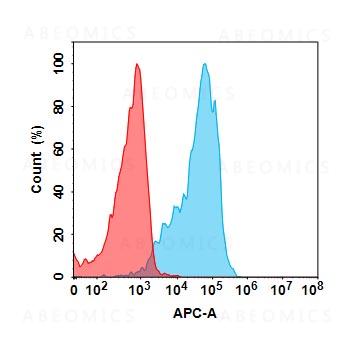 Figure 1. Flow cytometry analysis with 15μg/mL Anti-ROR2(ozuriftamab biosimilar) mAb on Expi293 cells transfected with Human ROR2 protein (Blue histogram) or Expi293 transfected with irrelevant protein (Red histogram).