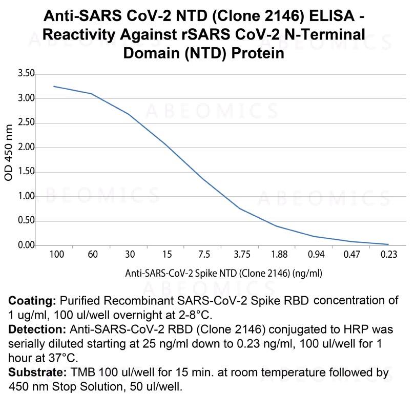 Specificity: Anti-SARS-CoV-2 Spike NTD-HRP, clone 2146, specifically targets an epitope on the SARS-CoV-2 spike protein N-terminal domain.