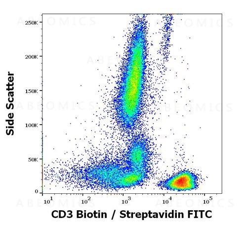 Figure 1: Flow cytometry surface staining pattern of human peripheral whole blood stained using anti-human CD3 (UCHT1) Biotin antibody and secondary stained using Streptavidin FITC (concentration in sample 2.5 μg/ml).