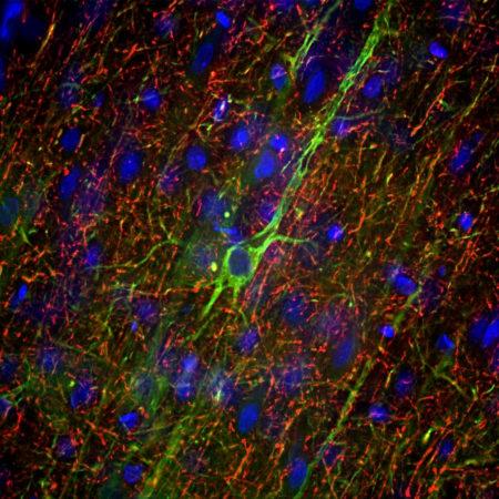 Figure-1: Immunofluorescence analysis of adult rat frontal cortex section stained with mouse mAb to neurofilament NF-M,(34-1085), dilution 1:5,000 in green, and costained with chicken pAb to neurofilament NF-H, (34-1080), dilution 1:5,000 in red. Following transcardial perfusion of rat with 4% paraformaldehyde, brain was post fixed for 24 hours, cut to 45μM, and free-floating sections were stained with above antibodies. (34-1085) antibody labels neuron cell bodies and dendrites of pyramidal neurons, as well as dendrites and axons of other neuronal cells, while the NF-H antibody, which is primarily directed against the heavily phosphorylated axonal forms of this molecule, and so stains the network of neuronal axons only.