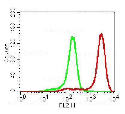 Figure-1: Cell surface flowcytometry analysis of hTLR5 on human PBMC (Monocytes) using 0.5 µg/10^6 Cells of Anti-TLR5 antibody (Clone: ABM22C2). Green represent isotype control and red represent Anti human TLR5 antibody (Abeomics 10-3014). Goat anti mouse PE conjugated was used as the secondary antibody.