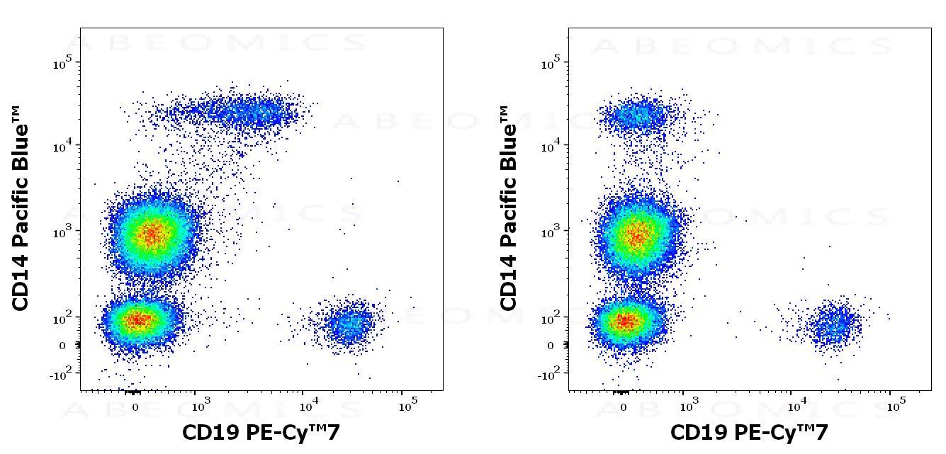 Figure 1: Flow cytometry multicolor surface staining patterns of human leukocytes stained using anti-human CD19 (LT19) PE-Cy™7 antibody and anti-human CD14 (MEM-15) Pacific Blue™ antibody. The picture on the left shows staining pattern without the use of Monocyte Blocking Buffer. The picture on the right shows staining pattern with the use of Monocyte Blocking Buffer. Only non-specific binding of tandem fluorochromes to monocytes is affected, specific binding of monocyte-marker CD14 is not affected by the use of Monocyte Blocking Buffer.