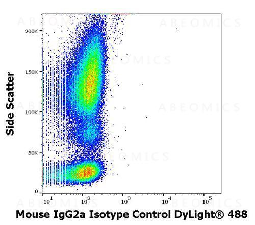 Figure 1 : Flow cytometry surface nonspecific staining pattern of human peripheral whole blood stained using mouse IgG2a Isotype control (MOPC-173) DyLight® 488 antibody (concentration in sample 9 µg/ml).