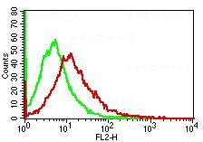 Fig:1- Cell surface flow analysis of hCD14 in human PBMC using 0.5 µg/10^6 cells. Green represents isotype control (ABEOMICS); red represents anti-hCD14 antibody (10-4077). Goat anti-mouse PE conjugated secondary antibody (ABEOMICS) was used.