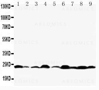 Figure 1: Anti-Bax antibody(39-2027). Western blotting: Lane 1: Rat Testis Tissue Lysate, Lane 2: Rat Kidney Tissue Lysate, Lane 3: Rat Brain Tissue Lysate, Lane 4: Rat Ovary Tissue Lysate, Lane 5: HELA Cell Lysate, Lane 6: MM231 Cell Lysate, Lane 7: A549 Cell Lysate, Lane 8: JURKAT Cell Lysate, Lane 9: Human Placenta Tissue Lysate.