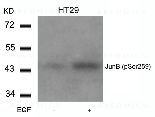 Figure 1: Western blot analysis of extracts from HT29 cells untreated or treated with EGF using JunB(Phospho-Ser259) Antibody 35-1026 .