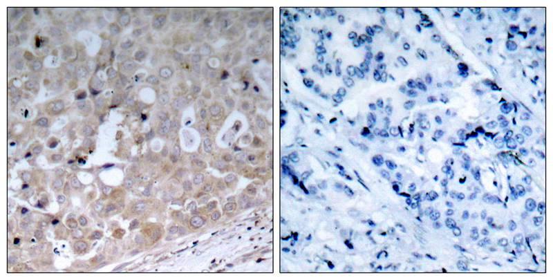 Figure 1: Immunohistochemical analysis of paraffin-embedded human breast carcinoma tissue using VEGFR2(Ab-1175) Antibody 35-1431 (left) or the same antibody preincubated with blocking peptide(right).