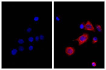 Figure 1: Human pancreatic carcinoma cell line MIA PaCa-2 was stained with Mouse Anti-Cytokeratin 18 followed by Rat Anti-Mouse IgG2b-Biotin and then Streptavidin-CY3 and DAPI.
