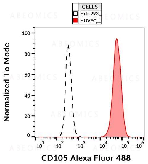 Figure 1: Flow cytometry analysis (surface staining) of HUVEC (human umbilical vein endothelial cells) and HEK-293 cells with anti-CD105 (MEM-226) Alexa Fluor 488.