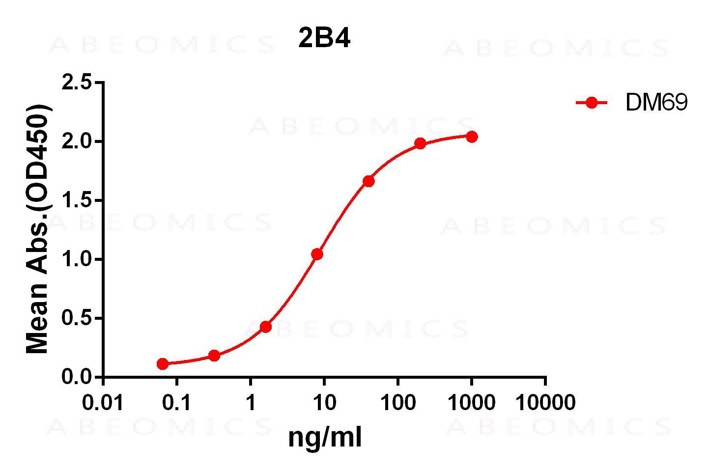 Figure 1. ELISA plate pre-coated by 2 µg/ml (100 µl/well) Human 2B4 protein, mFc-His tagged protein can bind Rabbit anti-2B4 monoclonal antibody (clone: DM69) in a linear range of 1-100 ng/ml.
