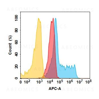 Figure 1. 5T4 protein is highly expressed on the surface of Expi293 cell membrane. Flow cytometry analysis with 15 μg/mL Anti-5T4 (GEN-1044 biosimilar) mAb on Expi293 cells transfected with human 5T4 (Blue histogram) or Expi293 transfected with irrelevant protein (Red histogram),and Isotype antibody on Expi293 transfected with irrelevant protein (Orange histogram)