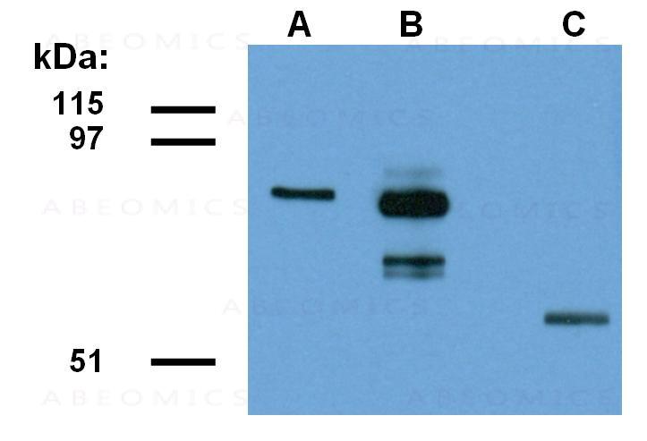 Figure 1: Detection of ABRA1-EGFP fusion protein in lysate of transfected HEK293 cells. Lane A: Immunostaining with anti-ABRA1 (clone ABRA1-01). Lane B: Immunostaining with anti-EGFP (polyclonal). Lane C: Immunostaining with anti-alpha tubulin (clone TU-01)