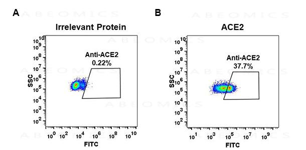 Figure 1. Expi 293 cell line transfected with irrelevant protein (left) and human ACE2 (right) were surface stained with Rabbit anti-ACE2 monoclonal antibody 1µg/ml (clone: DM47) followed by Alexa 488-conjugated anti-rabbit IgG secondary antibody.