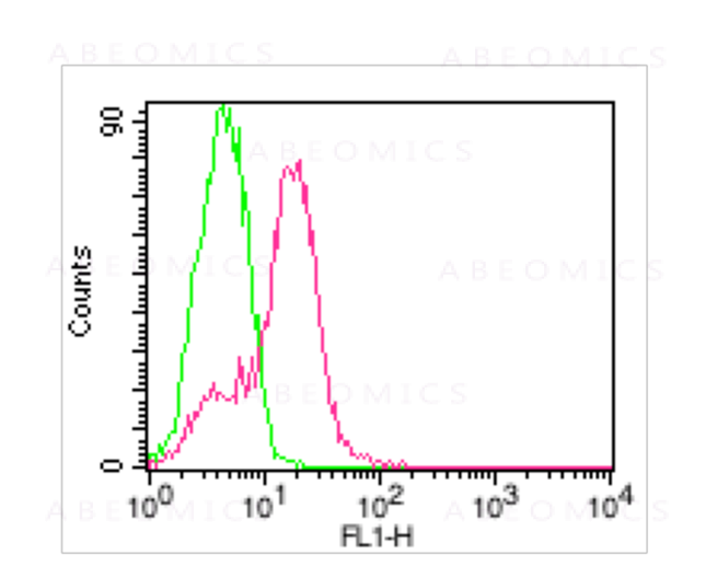 Fig.1: Cell Surface staining of ACE2 on HepG2 cell line. Red: Atto 488 conjugated human anti-ACE2 antibody (clone AC18F) (1ug/10^6 cells) was used. Green: Atto 488 conjugated Isotype control, mouse IgG1 Atto 488 (1ug/ 10^6 cells) was used as control.