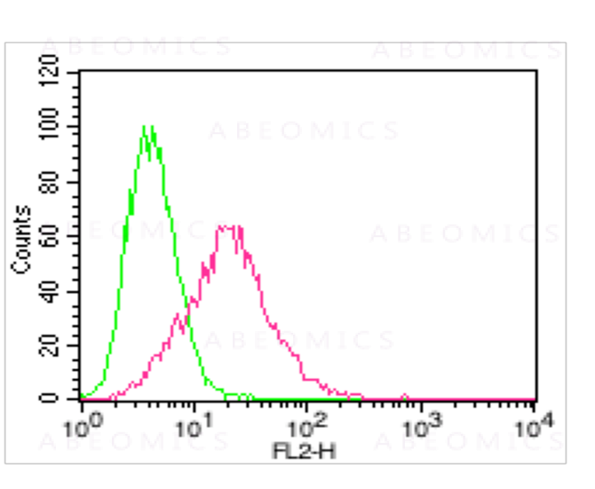 Fig.1: Cell Surface staining of ACE2 on HepG2 cell line. Red: Biotin conjugated human anti-ACE2 antibody (Clone: AC18F), 1ug/10^6 cells were used. Green :Biotin conjugated Isotype control, mouse IgG1 Biotin 1ug/ 10^6 cells was used as control. Streptavidin conjugated PE was used as secondary antibody.