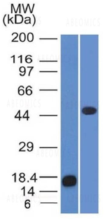 Fig.1: Western Blot of recombinant Adipophilin and Jurkat cell lysate using Adipophilin Mouse Monoclonal Antibody (ADFP/1365).