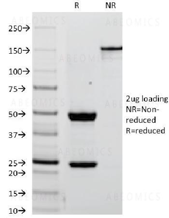 Fig. 1: SDS-PAGE Analysis Purified PLAP Mouse Monoclonal Antibody (ALPP/238). Confirmation of Integrity and Purity of Antibody.