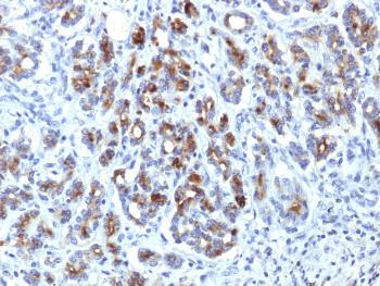 Fig.1: Formalin-fixed, paraffin-embedded human Pancreas stained with Alpha-1-Antichymotrypsin Mouse Monoclonal Antibody (AACT/1451)