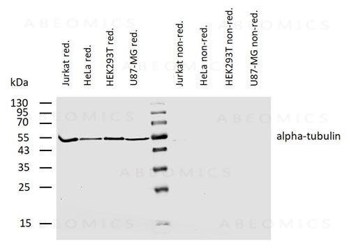 Figure 1: Western blotting analysis of human alpha-tubulin using rat monoclonal antibody YOL1/34 on lysates of various cell lines under reducing and non-reducing conditions. Nitrocellulose membrane was probed with 2 µg/ml of rat anti-alpha-tubulin monoclonal antibody followed by IRDye800-conjugated anti-rat secondary antibody. A specific band was detected for alpha-tubulin at approximately 54 kDa.