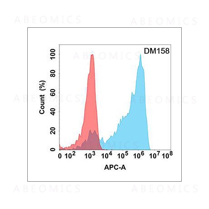 Figure 1. Flow cytometry analysis with Anti-AXL (DM158) on Expi293 cells transfected with human AXL (Blue histogram) or Expi293 transfected with irrelevant protein (Red histogram).