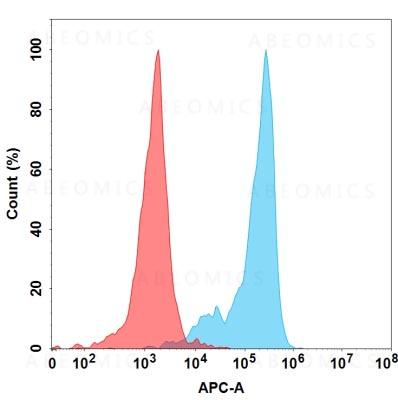 Figure 1. Flow cytometry analysis with 15 μg/mL Anti-B7-H2 (prezalumab biosimilar) mAb on Expi293 cells transfected with Human B7H2 protein (Blue histogram) or Expi293 transfected with irrelevant protein (Red histogram).