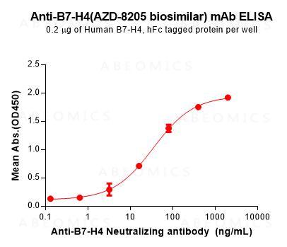 Figure 1. ELISA plate pre-coated by 2 μg/mL (100 μL/well) Human B7-H4 Protein, hFc Tag can bind Anti-B7-H4(AZD-8205 biosimilar) mAb in a linear range of 3.20-80 ng/mL.In order to specifically detect , mouse anti-human Fab-specific antibody was used as detection antibody.