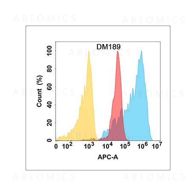 Figure 1. BCL2L1 protein is highly expressed on the surface of Expi293 cell membrane. Flow cytometry analysis with Anti-BCL2L1 (DM189) on Expi293 cells transfected with human BCL2L1 (Blue histogram) or Expi293 transfected with irrelevant protein (Red histogram), and Isotype antibody on Expi293 transfected with irrelevant protein (Orange histogram).
