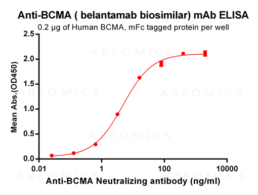 Figure-1: ELISA plate pre-coated by 2 μg/ml (100 μl/well) Human BCMA, mFc tagged protein can bind Anti-BCMA Neutralizing antibody in a linear range of 0.64-80.0 ng/ml.