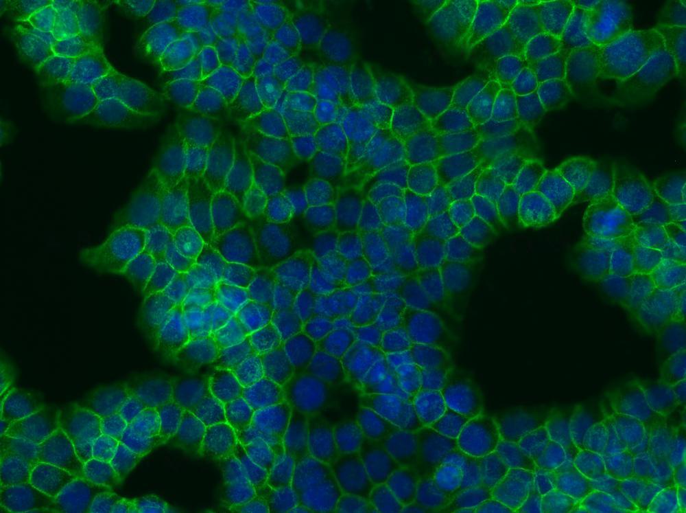 Figure 1: Immunocytochemistry staining of beta-catenin in human colon adenocarcinoma cell line HT29 using EM-22 antibody (green). Cell nuclei visualized by DAPI (blue).