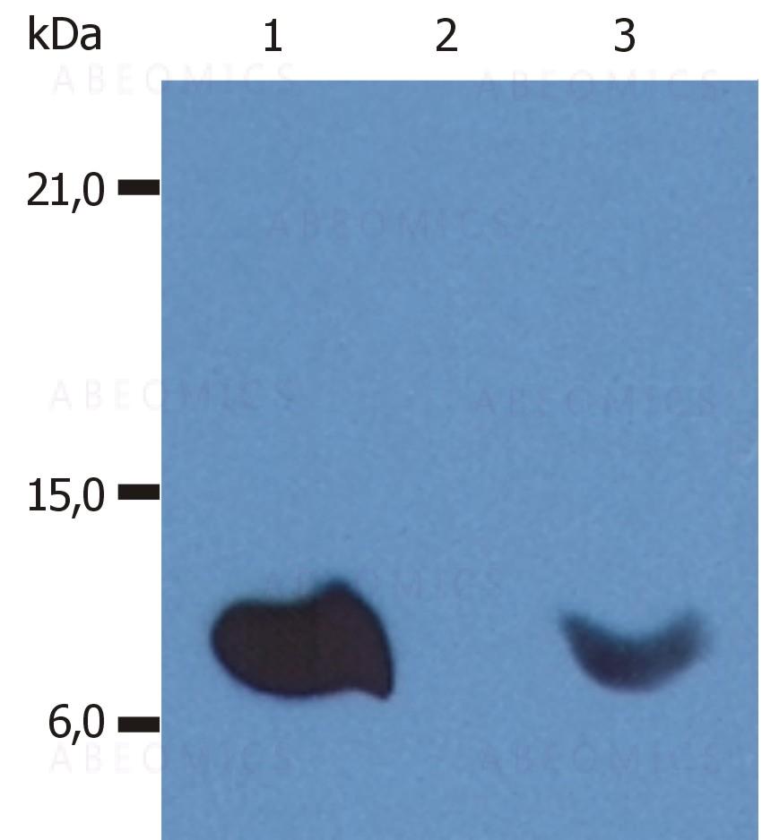 Fig. 1: Western Blotting analysis (non-reducing conditions) of whole cell lysate of various cell lines using anti-human beta2-microglobulin (B2M-01). Lane 1: RAJI human Burkitt lymphoma cell line. Lane 2: EL4 mouse lymphoblastic lymphoma cell line. Lane 3: U937 human histiocytic lymphoma cell line