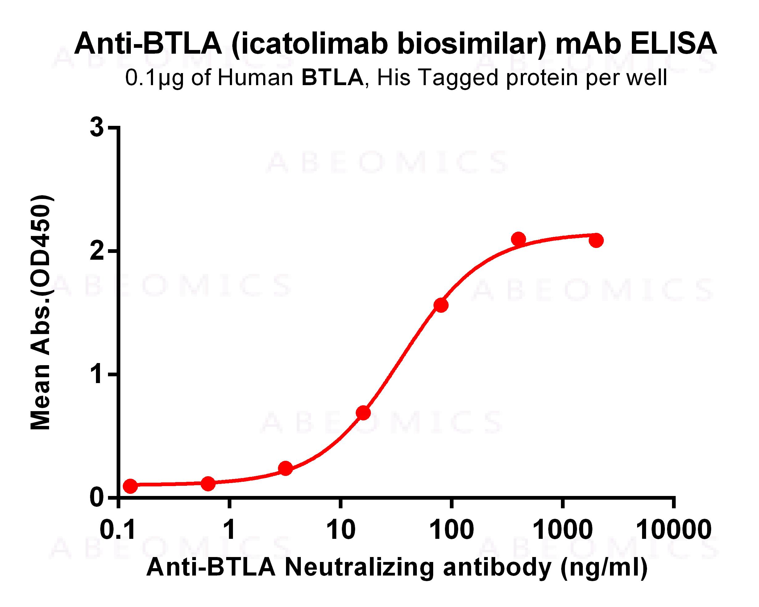 Figure 1. ELISA plate pre-coated by 1 µg/ml (100 µl/well) Human BTLA , His tagged protein can bind Anti-BTLA Neutralizing antibody in a linear range of 1-100 ng/ml.