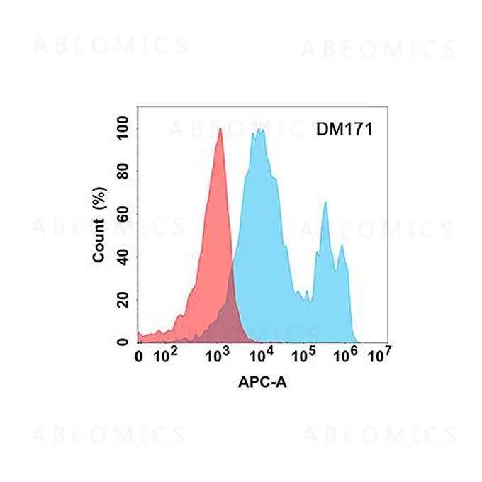 Figure 1. Flow cytometry analysis with Anti-CA9 (DM171) on Expi293 cells transfected with human CA9 (Blue histogram) or Expi293 transfected with irrelevant protein (Red histogram).