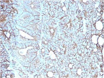 Fig.1: Formalin-fixed, paraffin-embedded human Colon stained with Cadherin 17 / CDH17 Mouse Monoclonal Antibody (CDH17/2617).