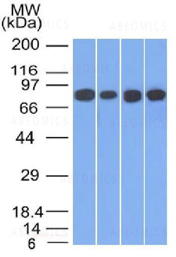 Fig. 1: Western Blot of HT20, A549, 293 and A431 cell lysates using C Catenin, gamma Mouse Monoclonal Antibody (11E4).