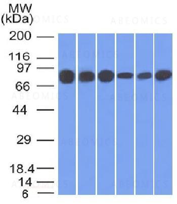 Fig. 1: Western Blot of HT20, 293, A431, MCF-7, HepG2 and A549 cell lysates using Catenin, gamma Mouse Monoclonal Antibody (15F11).