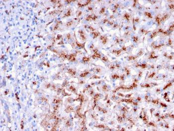 Fig. 1: Formalin-fixed, paraffin-embedded human Liver stained with Cathepsin D Mouse Monoclonal Antibody (CTSD/3276).