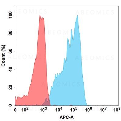 Figure 1. Flow cytometry analysis with 1 μg/mL Anti-CCR2 (plozalizumab biosimilar) mAb on Expi293 cells transfected with Human CCR2 protein (Blue histogram) or Expi293 transfected with irrelevant protein (Red histogram).