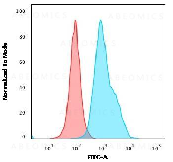 Fig. 1: Flow Cytometric Analysis of Ramos cells using CD10 Mouse Monoclonal Antibody (CB-CALLA) followed by goat anti-Mouse IgG-CF488 (Blue); Isotype control (Red).