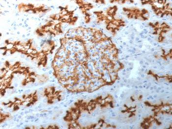 Fig. 1: Formalin-fixed, paraffin-embedded human Kidney stained with CD10 Mouse Monoclonal Antibody (MME/1892).
