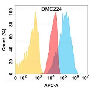 Figure 1. CD112 protein is highly expressed on the surface of Expi293 cell membrane. Flow cytometry analysis with Anti-CD112 (DMC224) on Expi293 cells transfected with human CD112 (Blue histogram) or Expi293 transfected with irrelevant protein (Red histogram), and Isotype antibody on Expi293 transfected with irrelevant protein (Orange histogram).