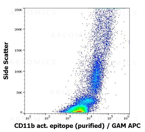 Specificity: The mouse monoclonal antibody CBRM1/5 recognizes an activation-dependent epitope on extracellular part of CD11b (Mac-1alpha), a 165-170 kDa type 1 transmembrane protein mainly expressed on monocytes, granulocytes and NK-cells. The antibody recognizes a subset of CD11b molecules on neutrophils and monocytes activated with chemoattractants or phorbol esters and it does not recognize CD11b on non-activated cells.