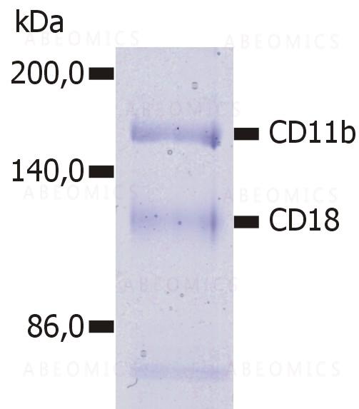 Figure 1: Immunoprecipitation of human CD11b/CD18 heterodimer from the lysate of washed PBMC isolated from healthy donor. Lysate was subjected to affinity column chromatography using anti-human CD11b (MEM-174) immunosorbent. Eluted immunoprecipitate was resolved on 7.5% SDS-PAGE and stained with Coomasie Blue.