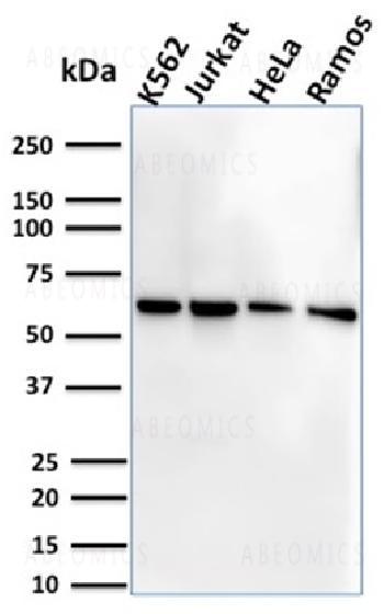 Fig. 1: Western Blot Analysis of Human K562, Jurkat, HeLa and Ramos cell lysate using CD127 Mouse Monoclonal Antibody (IL7R/2751).
