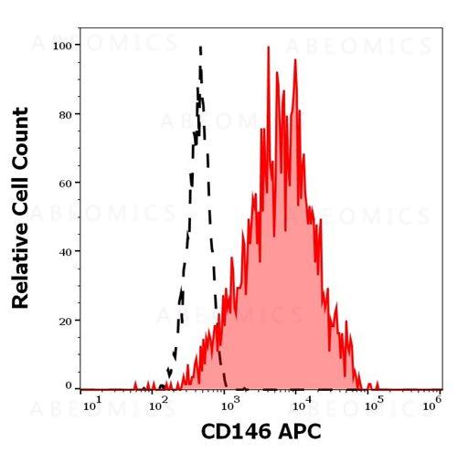 Figure 1: Separation of HUVEC cells stained using anti-human CD146 (P1H12) APC antibody (10 μl reagent per million cells in 100 μl of cell suspension, red-filled) from HUVEC cells stained using mouse IgG1 isotype control (MOPC-21) APC antibody (black-dashed) in flow cytometry analysis (surface staining).