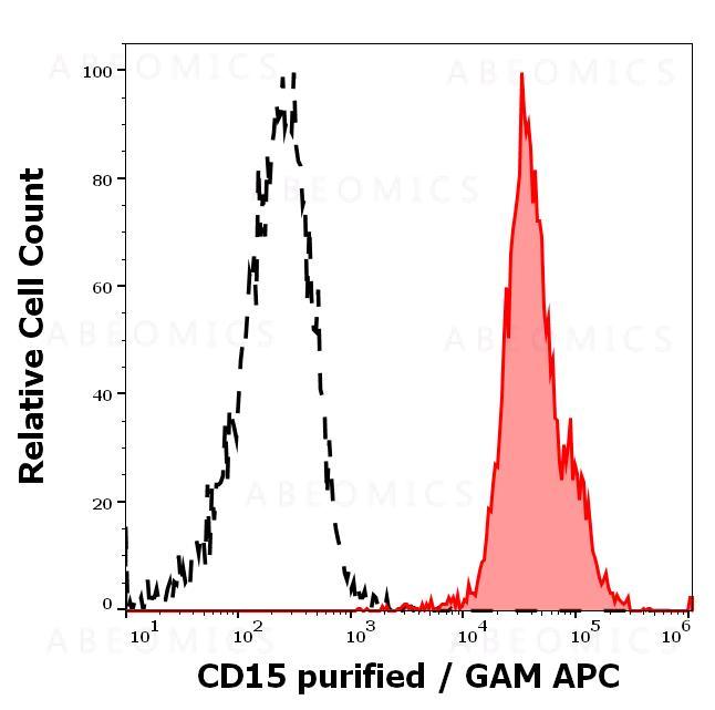 Figure 1: Separation of human neutrophil granulocytes (red-filled) from lymphocytes (black-dashed) in flow cytometry analysis (surface staining) of human peripheral whole blood stained using anti-human CD15 (MMA) purified antibody (concentration in sample 0.56 μg/ml) GAM APC.