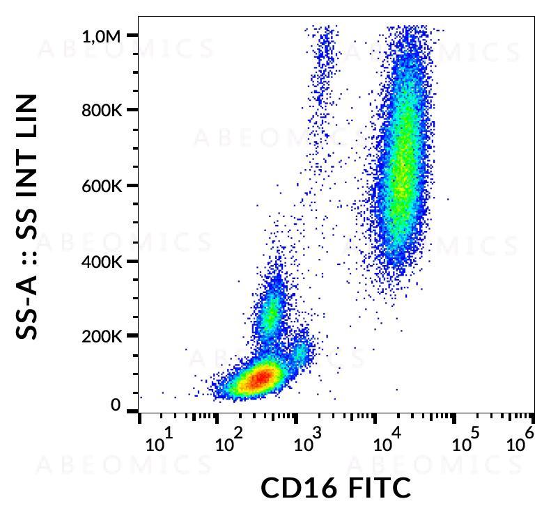 Flow cytometry analysis (surface staining) of human peripheral blood cells with anti-human CD16 (MEM-154) FITC.