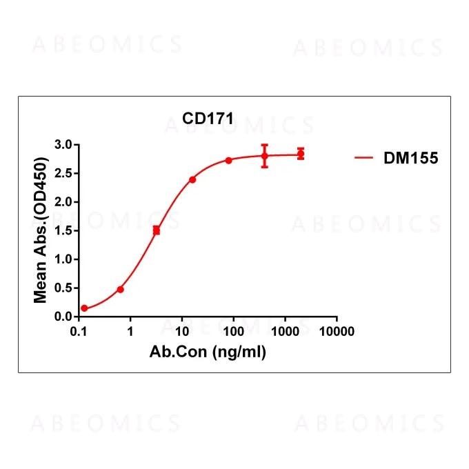 Figure 1. ELISA plate pre-coated by 1 μg/ml (100 μl/well) Human CD171 protein, His tagged protein can bind Rabbit anti-CD171 monoclonal antibody(clone: DM155) in a linear range of 1-100 ng/ml.