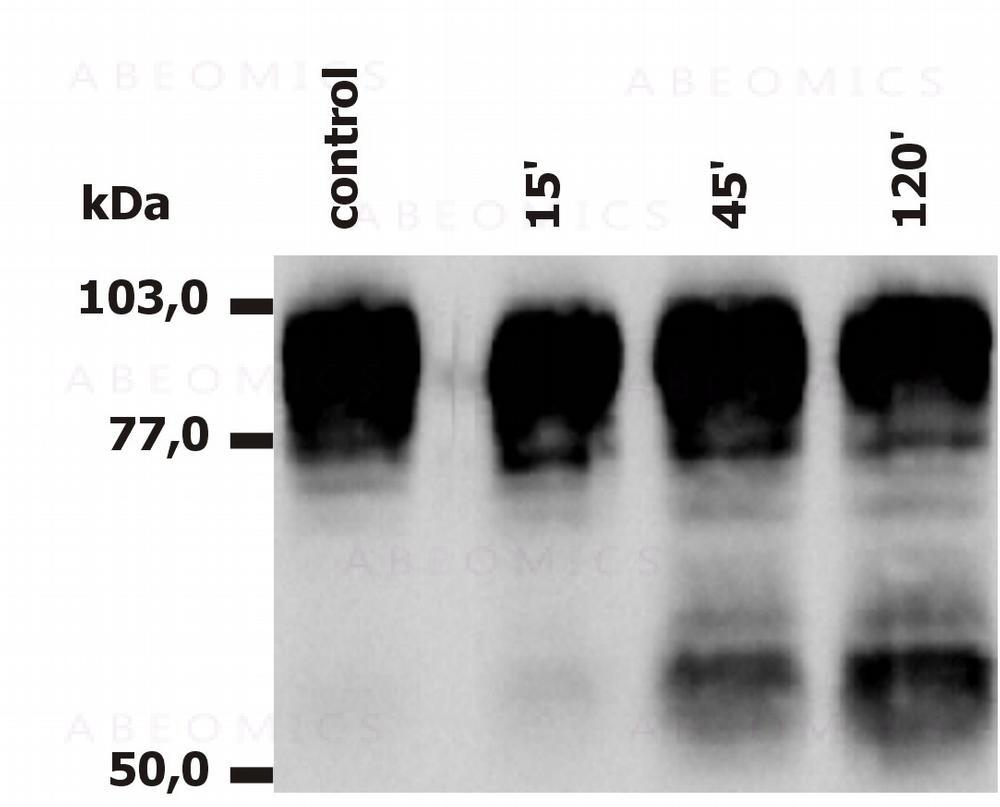Figure 1: Western Blotting analysis of PMA-activated neutrophils, using anti-human CD18 (MEM-148). The antibody MEM-148 recognizes the lower 65 to 70 kDa zone (activation marker) as well as the upper 78 to 96 kDa zone (CD18).